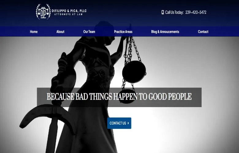 Difilippo & Pica, PLLC is located in Fort Myers. Their website features a blue branding pallet with black and white attorney biography photos.