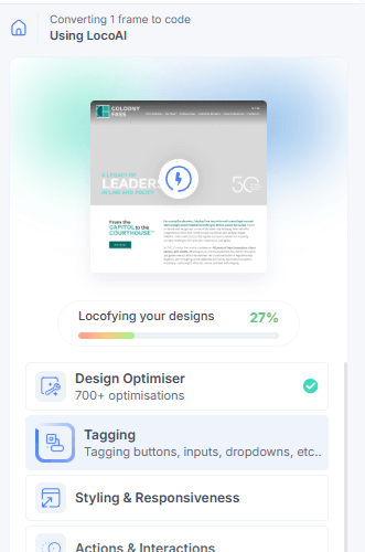 Locofy operates on a token system (LD Tokens), and the economics are worth describing. During our test, a single 1280px homepage frame used an estimated 138 of our 600 free tokens just to generate the code.